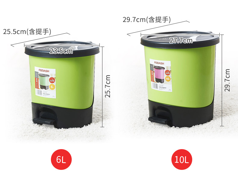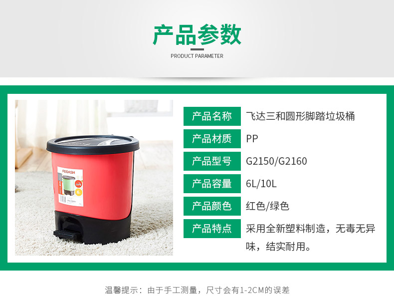 品牌名称:乐玩(中国)三和 生产地区:中国·浙江·台州 乐玩(中国)货号:G2150/G2160 装箱数:12/8 乐玩(中国)尺寸:255*235*257mm/297*277*302mm 外箱尺寸:735*495*530mm/1045*540*320mm 条形码:6931643812894/6931643812900 乐玩(中国)三和G2150圆形脚踏垃圾桶(6L)/G2160圆形脚踏垃圾桶(10L)