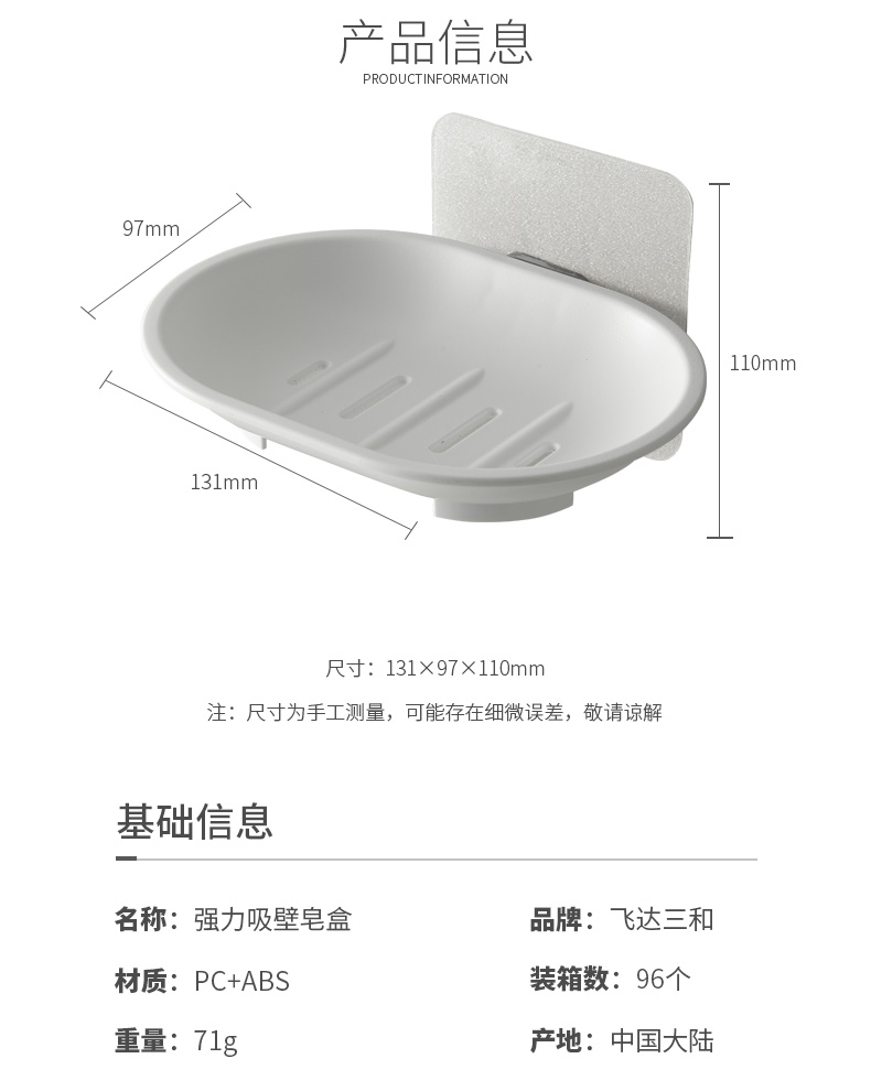品牌名称:乐玩(中国)三和 生产地区:中国·浙江·台州 乐玩(中国)货号:R5340 装箱数:96 乐玩(中国)尺寸:13.1*9.7*11cm 外箱尺寸:56*33.5*37cm 条形码:6931643818261 乐玩(中国)三和R5340 强力吸壁皂盒