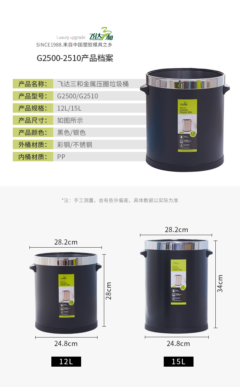 品牌名称:乐玩(中国)三和 生产地区:中国·浙江·台州 乐玩(中国)货号:G2500/G2510 装箱数:8/8 乐玩(中国)尺寸:282*248*280mm/282*248*340mm 外箱尺寸:58*57.5*58cm/58*57.5*70cm 条形码:6931643816168 / 6931643816175 乐玩(中国)三和G2500经典垃圾桶12L/G2510经典垃圾桶15L(砂钢)
